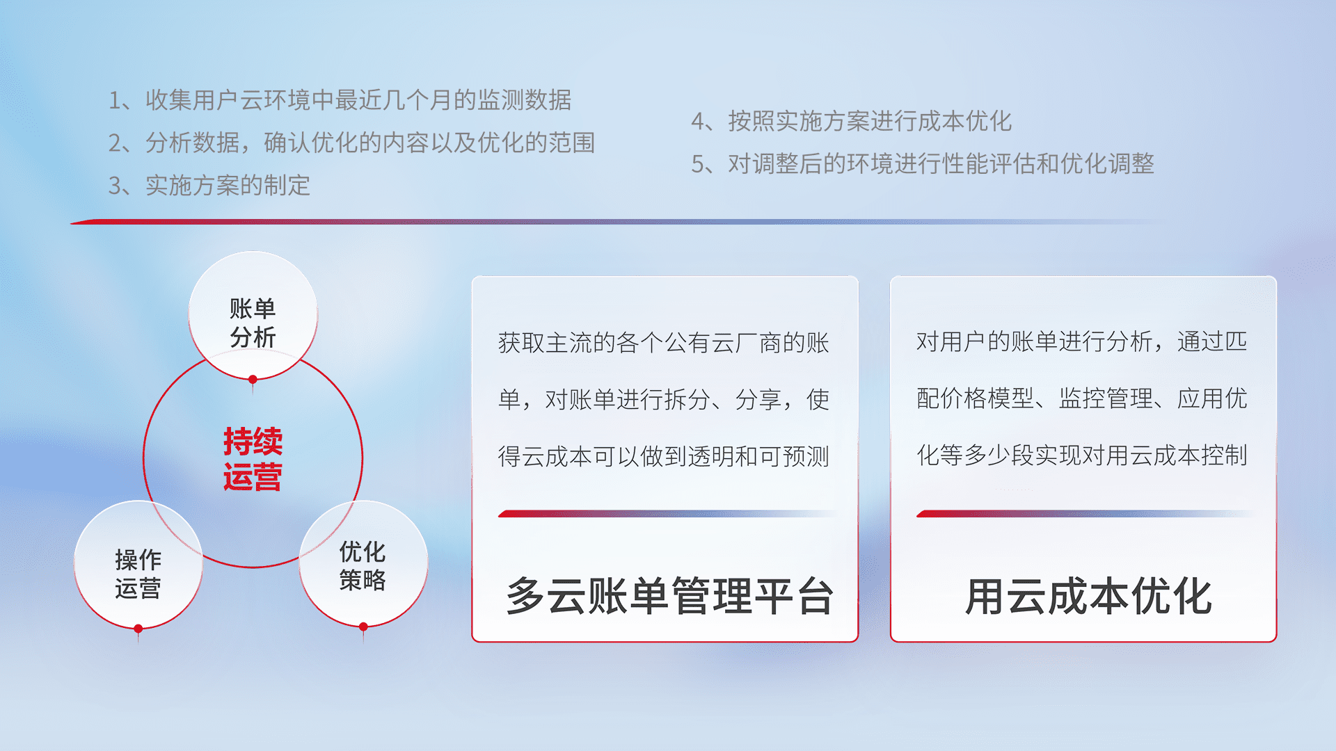 通过多云纳管,,,以统一的资源数据模型把客户的云资源进行抽象和封装,,进而实现对多云资源的统一操作,,,,保障云资源管理的可靠性、、稳定性与可用性。。。。量身定制化运维内容,,配置、、、、开发运维、、补丁管理、、、、备份、、监控、、、、认证和访问管理、、审计和日常巡检等,,,,保障在用云过程中的可靠度,,,稳定度以及高可用率。。